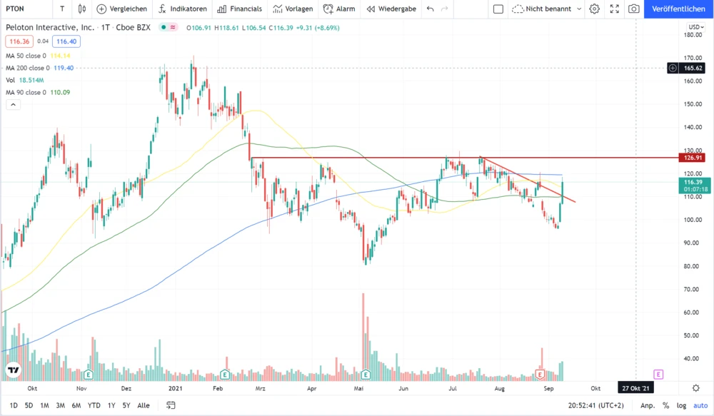 An der Nasdaq kam die Nachricht gut an: Die Peloton-Aktie schnellte am Freitag zeitweise um 10,7 Prozent auf 118,61 Dollar nach oben. Damit haben die Papiere die 90-Tage-Linie bei 110,09 Dollar sowie die 50-Tage-Linie bei 114,14 Dollar klar hinter sich gelassen und zwei starke Kaufsignale geliefert. Auch der seit Juli andauernde Abwärtstrend ist aus charttechnischer Sicht gebrochen, sofern die Peloton-Aktie die Kursgewinne bis zum Handelsschluss halten kann. Gelingt es zudem, die 200-Tage-Linie bei 119,40 Dollar zurückzuerobern, dürfte sich die am Donnerstag gestartete Aufwärtsbewegung dynamisch fortsetzen. Nächstes Etappenziel ist dann der horizontale Widerstand bei 126,91 Dollar.