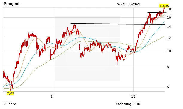 An der Börse wird Peugeot derzeit mit knapp 14 Milliarden Euro bewertet, macht ein Kurs-Umsatz-Verhältnis (KUV) von 0,25. Zum Vergleich: Daimler oder VW werden mit einem KUV zwischen 0,5 und 0,8 gehandelt. Nach dem Ausbruch der Peugeot-Aktie über das alte Hoch lautet das nächste Etappenziel 20 Euro.