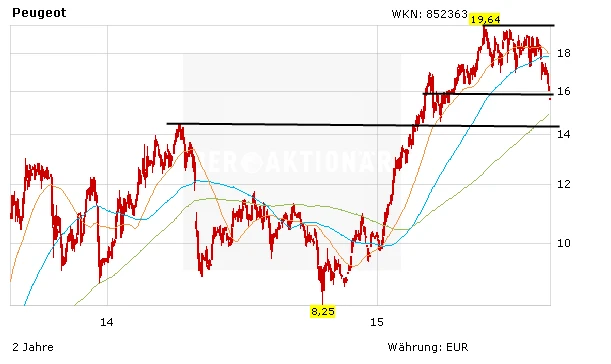 Auch die Aktie von Peugeot kann sich dem Abwärtstrend der Automobilwerte nicht entziehen. Im Gegensatz zu den deutschen Autobauern BMW, Daimler und Volkswagen kommt das Papier von Peugeot allerdings noch glimpflich davon. Die Abhängigkeit von China ist weniger stark als die der deutschen Hersteller. VW hängt am stärksten am China-Tropf. Knapp 40 Prozent tragen die Verkäufe in China zum Umsatz bei. Bei Daimler und BMW sind es zwischen 24 und 29 Prozent.