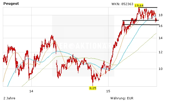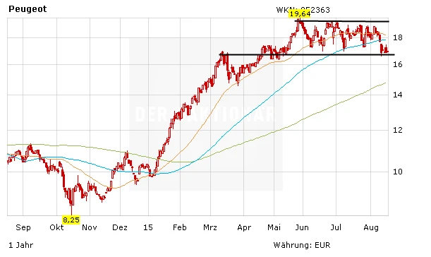 Anleger setzen hier weiter auf einen Turnaround. Peugeot ist gut in der Spur, die letzten Zahlen konnten das belegen. Der Umsatz stieg im ersten Halbjahr um 6,9 Prozent auf 28,9 Milliarden Euro. Den operativen Gewinn konnten die Franzosen mehr als verdreifachen: von 387 Millionen Euro auf 1,42 Milliarden. Damit übertraf Peugeot die Erwartungen der Analysten deutlich.