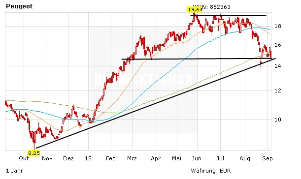 DER AKTIONÄR bleibt langfristig von der Comeback-Story Peugeot überzeugt. Jetzt geht es darum, für die Aktie die richtigen Auffanglinien zu finden. Derzeit trifft die Aktie auf wichtige Unterstützungen. Bei knapp über 15 Euro verläuft die 200-Tage-Linie. Weiterhin der langfristige Aufwärtstrend seit Oktober 2014. Erste kleine Käufe sind auf diesem Niveau wieder sinnvoll. Die Position kann im Anschluss aufgestockt werden, wenn sich die Märkte wieder in ruhigerem Fahrwasser bewegen.
