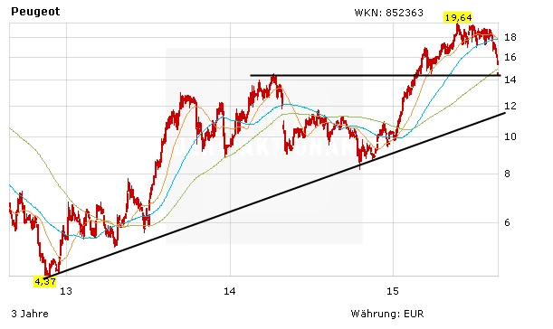 Die Aktie des französischen Autobauers Peugeot hat sich in den letzten Wochen gegenüber der Konkurrenz noch gut gehalten. Während BMW, Daimler und Volkswagen seit dem Höchstkurs im März zwischen 25 und 35 Prozent verloren haben, kam das Papier von Peugeot mit einem Minus von 19 Prozent noch gut weg. Fundamental hat sich nichts geändert. Die Zeichen stehen auf Turnaround-Kurs. Die letzten Zahlen fielen sehr gut aus. Umsatz plus drei Prozent, Gewinn verdreifacht.
