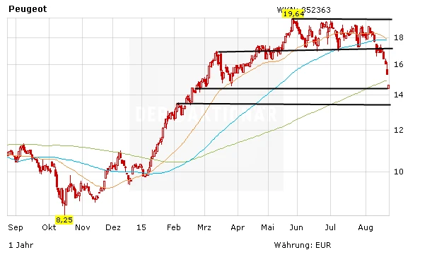 Nachdem die Aktie allerdings unter die Unterstützung bei 17,40 Euro gefallen ist, nahm auch bei Peugeot der Verkaufsdruck zu. Die nächste Widerstandslinie liegt jetzt bei 14.20 Euro. Auch Analyst Jose Asumendi von JPMorgan bleibt optimistisch. Die Autobauer seien sich der schleppenden Nachfrage in China bewusst, passten bereits ihre Produktion entsprechend an und erhöhten die Preisnachlässe. Lediglich wenn der Absatz deutlich einbreche, könnten die hohen Lagerbestände zur Belastung werden. Das Kursziel für die Peugeot-Aktie lautet 27 Euro.