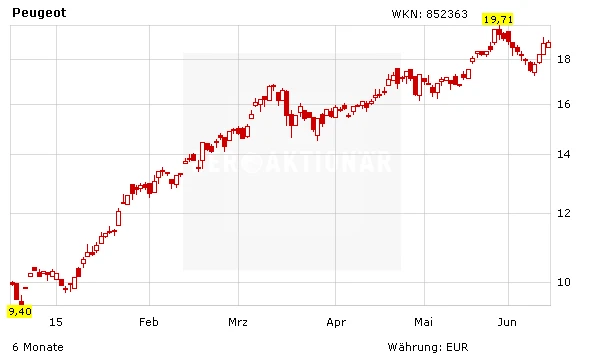 Die Analysten jedenfalls sind voll des Lobes. Vor wenigen Tagen hat die HSBC Peugeot zum Kauf empfohlen. Das Kursziel wurde von 20 auf 24 Euro angehoben. Analyst Horst Schneider rechnet mittlerweile mit einer deutlich schnelleren Ergebniserholung als bisher. Der Experte hob seine Prognose für den Gewinn je Aktie um 60 Prozent an.