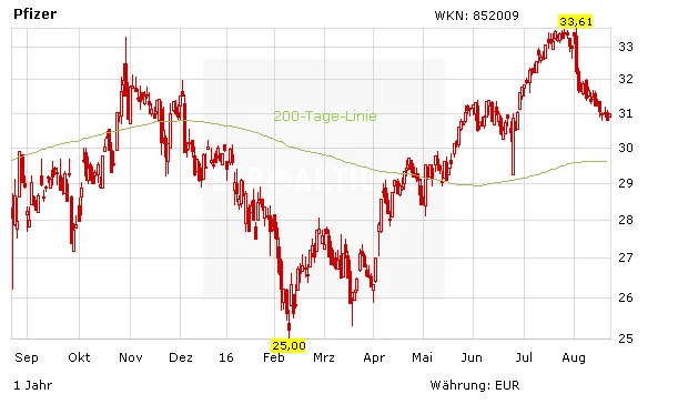 Die 14 Milliarden Dollar, die Pfizer für Medivation zahlen will, sind eine Hausnummer. Vor allem, wenn man bedenkt ,dass das Unternehmen zuletzt auf rund sechs Milliarden Dollar geschätzt wurde. Pfizer dürfte heute Nachmittag im amerikanischen Handel deshalb unter Druck geraten. Erfüllen sich aber die mit der Übernahme verbundenen Hoffnungen, dürfte der Kurs von Pfizer bald wieder anziehen. Anleger warten vor einem Einstieg den Bruch des Hochs bei 36,89 Dollar ab.
