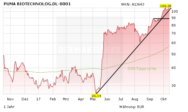 Im Bereich der Übernahmekandidaten unter den Onkologie-Spezialisten fällt auch immer häufiger der Name Puma Biotechnology. Mit Nerlynx verfügt das kleine Biotech-Unternehmen einen vielversprechenden Wirkstoff gegen HER2-positiven Brustkrebs. Und der Bedarf in dieser Indikation ist enorm: Analysten trauen dem Krebsmittel im Jahr 2020 durchschnittlich ein Umsatzpotenzial von 886 Millionen Dollar zu. Puma Biotechnology bringt aktuell 4,6 Milliarden Dollar auf die Börsenwaage. Und auch der Chartverlauf der Aktie von Puma Biotech spricht Bände. Er gleicht dem von Kite Pharma vor der milliardenschweren Übernahme von Gilead.