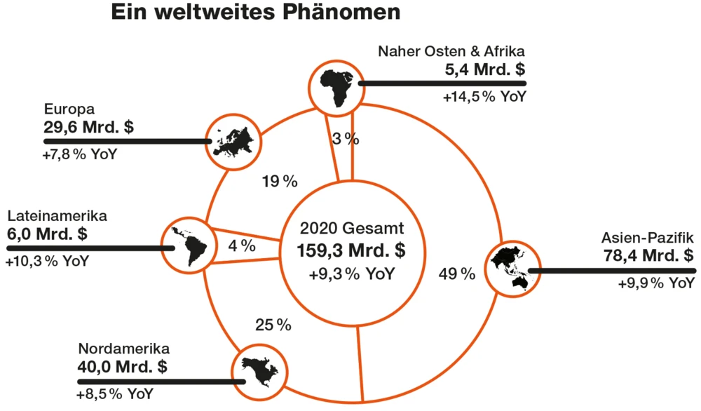 Der Gaming-Gesamtmarkt dürfte 2020 um 9,3 Prozent auf 159,3 Milliarden Dollar anwachsen. China ist dabei mit Abstand der größte Einzelmarkt – doch auch weltweit wird immer mehr gezockt. Quelle: Newzoo