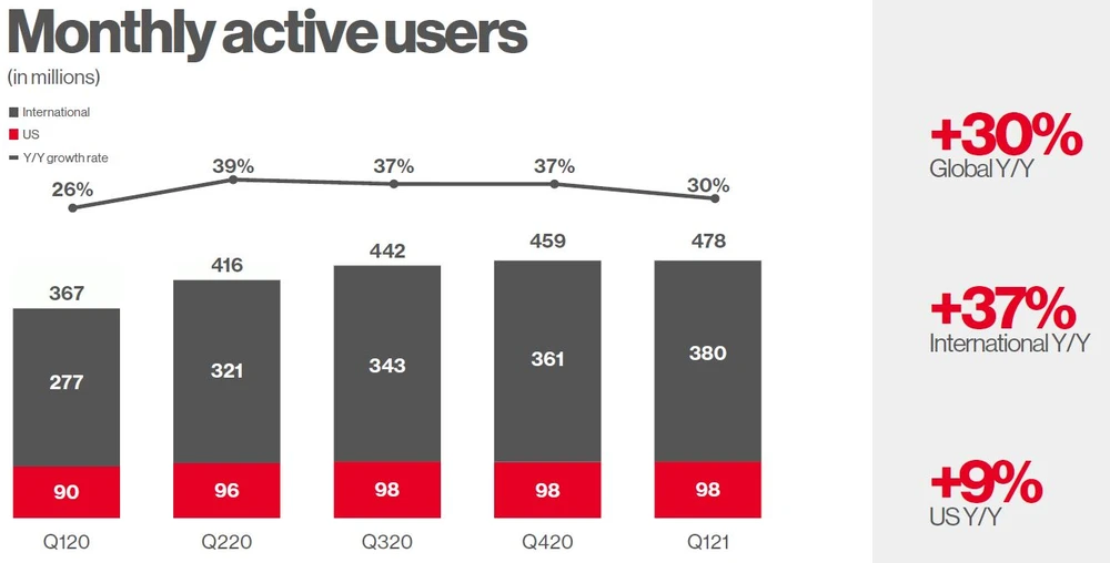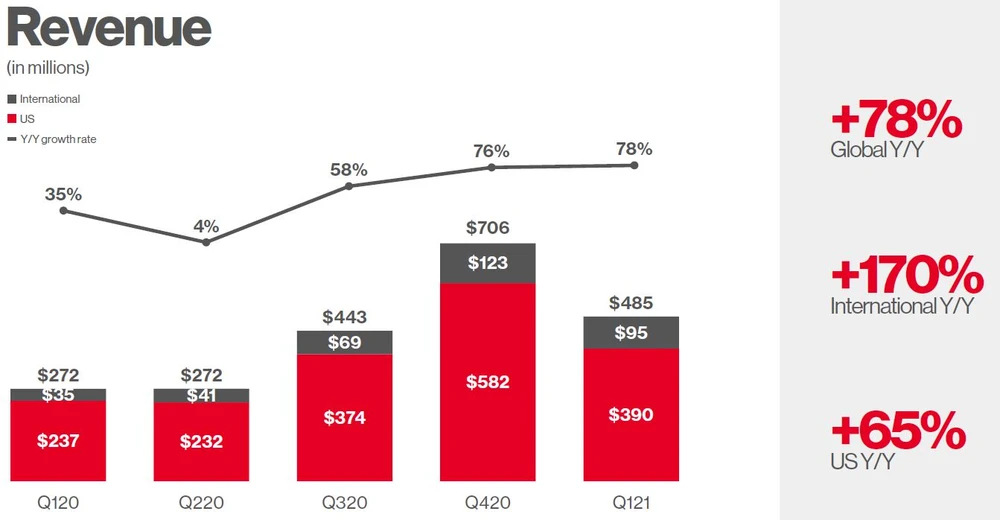 Pinterest hat im ersten Quartal erneut einen kräftigen Umsatzzuwachs von 78 Prozent auf 485 Millionen Dollar erzielt und damit die Erwartungen der Analysten von 471 Millionen Dollar übertroffen. Auch die Gewinne je Aktie von 0,11 Dollar lagen über den geschätzten 0,08 Dollar.