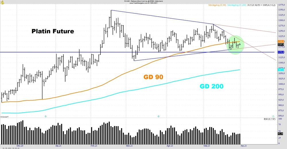 Der Platin-Future pendelt aktuell in einer engen Seitwärtsrange, wird die 1.150-Dollar-Marke verteidigt, dürfte der Preis weiter anziehen.