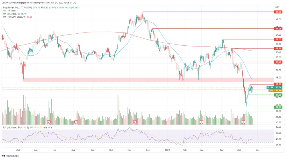 Nach dem massiven Einbruch zum Monatsbeginn um bis zu 46 Prozent fiel die Plug-Power-Aktie auf ein Mehrjahrestief bei 12,70 Dollar. Zuletzt notierte der Titel im Oktober 2020 auf diesem Niveau. An diesem Punkt wagten sich die Bullen wieder aus der Deckung und einige witterten eine gute Kaufgelegenheit.