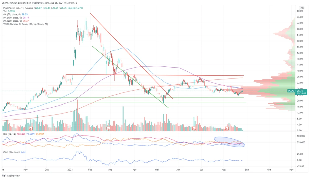 Nach dem massiven Abverkauf zwischen Februar und Mitte Mai ist es um die Plug-Power-Aktie deutlich ruhiger geworden. Infolge eines kräftigen Rebounds an der Unterstützungszone bei 19 Dollar gab es zwar zwischenzeitlich Hoffnung auf eine nachhaltige Trendwende, doch dieser Versuch scheiterte Ende Juni an der 100-Tage-Linie bei 35,67 Dollar. Seitdem bewegt sich der Titel innerhalb einer Range, die sich zwischen dieser Linie auf der Oberseite und der Horizontalen bei 22 Dollar ausspannt.