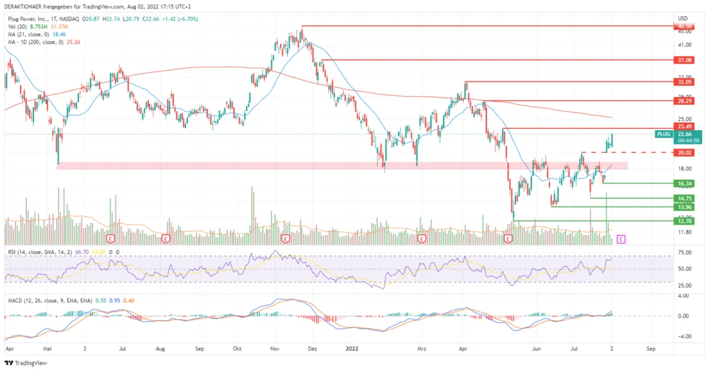 Green-Tech-Titel wie Plug Power rücken seit einigen Wochen wieder weiter nach oben auf der Kaufliste der Anleger. Die Aktie hat eine starke Trendwende vollzogen und ist auf dem Weg Richtung der wichtigen 200-Tage-Linie. Hier kann es zu einem Rücksetzer kommen. Mutige Anleger können diese Chance für einen Einstieg nutzen, um von der weiteren Erholung zu profitieren.