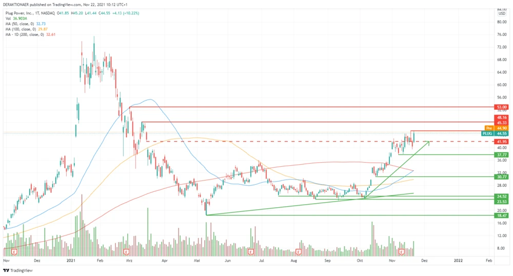 Morgan Stanley verleiht der Rally bei der Plug-Power-Aktie neue Impulse. Die Investmentbank schraubt ihr Kursziel um über 50 Prozent auf 65 Dollar. Die Bullen sind entsprechend euphorisiert und geben kräftig Gas. Investierte Anleger lassen die Gewinne weiter laufen. Trader, die mit Trading-Idee über 210 Prozent im Gewinn sind, halten ebenfalls an der Position fest, da weitere Kurssteigerungen möglich sind.