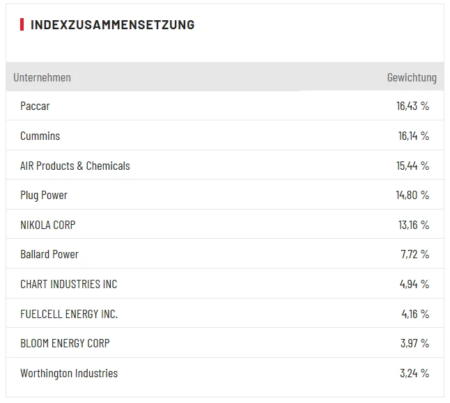 Komplettiert wird der Index mit dem Industriegase-Spezialisten Air Products, Bloom Energy, Chart Industries, Cummins, FuelCell Energy, Paccar und Worthington Industries. Alle diese Unternehmen haben einen Bezug zum Megatrend Wasserstoff. Cummins beispielsweise ist in der Vergangenheit als Aufkäufer vom Aktienreport-Tipp Hydrogenics in Erscheinung getreten. Zudem ist der Motorenhersteller an Loop Energy beteiligt.