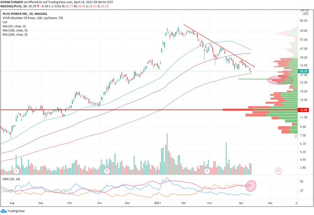 Die Trendstärke (siehe ADX-Indikator) der Abwärtsbewegung ist enorm hoch, sodass ein Bruch dieser Unterstützung relativ wahrscheinlich ist. In diesem Fall wäre mit einem weiteren Kursverfall bis mindestens an das Volume-Peak bei 24,50 Dollar zu rechnen.