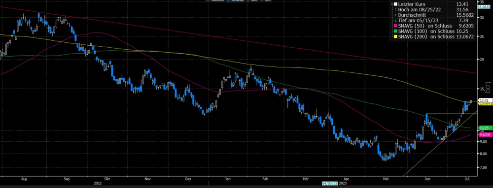 DER AKTIONÄR hat mit seiner Kaufempfehlung für spekulativ ausgerichtete Trader in Ausgabe 29/23 zum Kurs von 10,08 Euro ein gutes Händchen bewiesen. Knackt der Wert den GD200 nachhaltig, rückt das Februar-Hoch wieder ins Visier der Bullen. An schwachen Handelstagen können mutige Anleger auf eine Fortsetzung der Aufwärtsbewegung setzen. Der Stopp kann noch bei 8,00 Euro belassen werden.