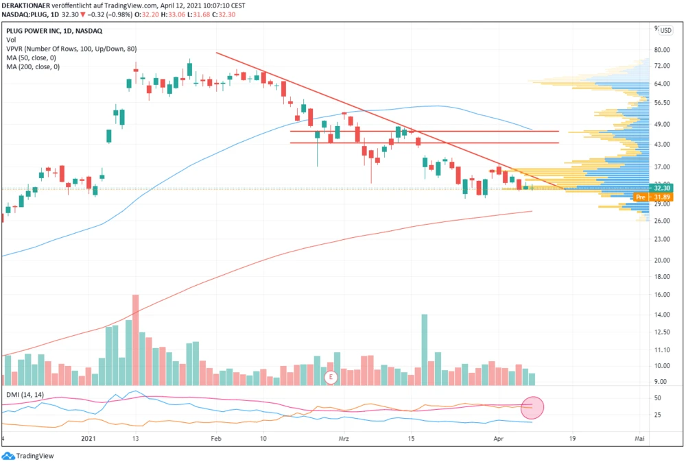 Auch letzte Woche hatte die Plug-Power-Aktie erneut um knapp zehn Prozent nachgegeben und setzte damit ihren steilen Abwärtstrend seit Mitte Februar fort. Aus charttechnischer Sicht spitzt sich gerade die Lage zu. Aktuell steht der Titel an der unteren Kante einer stark gehandelten Preiszone, die zwischen 31,50 und 32,50 Dollar verläuft.