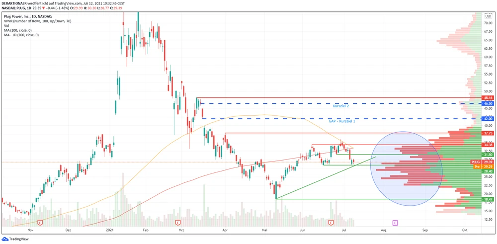 Der Kurs von Plug Power pendelt seit Monatsbeginn in einer Range und ist damit in eine Seitwärtsphase gewechselt. Die Unterstützung bei 28,40 Dollar bildet die untere Range-Kante. Auf der Oberseite blockiert aktuell der Widerstand bei 34,38 Dollar die weitere Erholung.