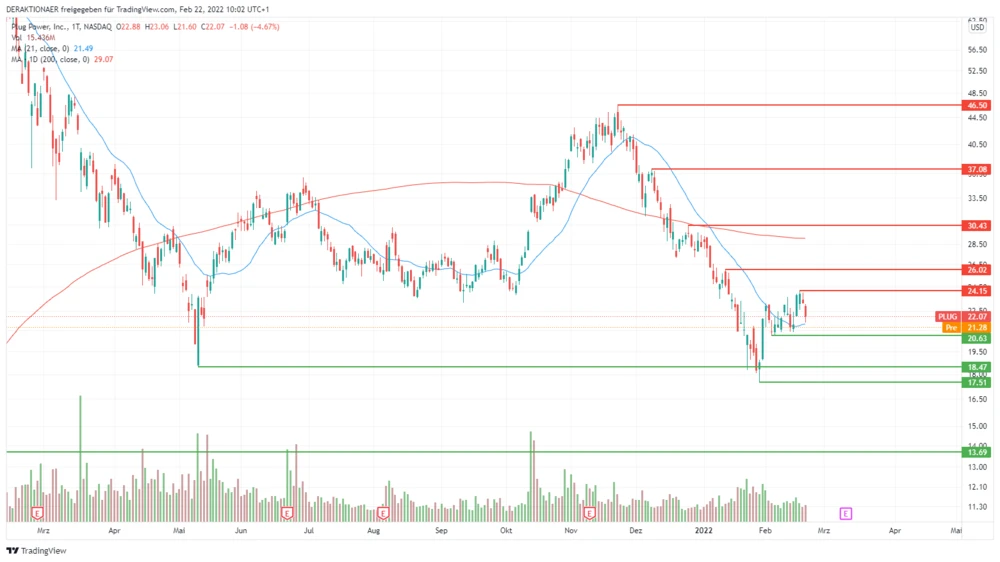 Die Anspannung steigt bei den Anlegern weiter, nachdem Russland weitere Schritte in Richtung Ukraine eingeleitet hat. Relativ stabil hält sich jedoch die Aktie von Plug Power. Der Titel wurde aufgrund des Feiertages gestern nicht gehandelt, aber die Entwicklung im Februar gibt Anlass zur Hoffnung. Diese Marken sind für die weitere Erholung wichtig.