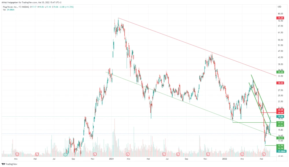 Der mittelfristige Abwärtstrend ist allerdings weiterhin intakt. Plug Power ist also noch nicht über den Berg. Erst, wenn die Aktie die mittelfristige Abwärtstrendlinie bei aktuell 33,50 Dollar überwinden kann, kann man von einer Trendumkehr sprechen.