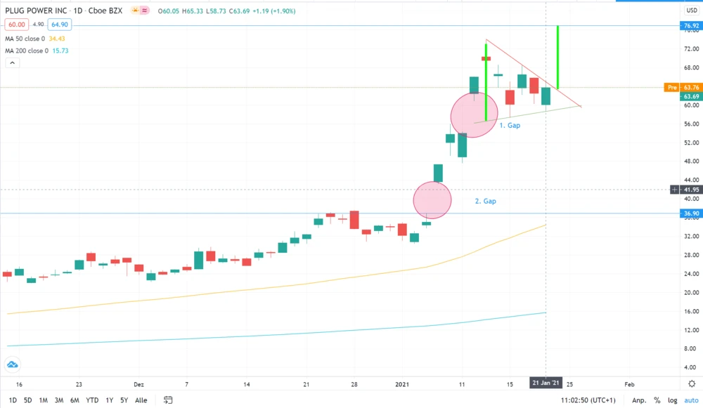 Bei Plug Power steht in Kürze eine wichtige Entscheidung an. Gelingt der Ausbruch nach oben, dürfte die Aktie ihren Aufwärtstrend fortsetzen und ein neues 52-Wochen-Hoch markieren. Investierte bleiben daher an Bord. Trader können bei einem Sprung über die obere Begrenzung des Dreiecks bei 63,10 Dollar (das sind umgerechnet 51,84 Euro) zugreifen. Ein Stoppkurs bei 40 Euro ist Pflicht.