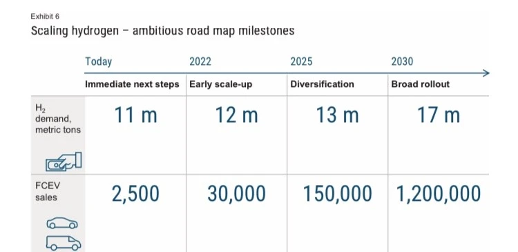 Plug Power und Ballard Power werden auch von spannenden Wasserstoff-Visionen getrieben. So geht Plug Power gerade mit der der McKinsey Studie ‘Road Map to a US Hydrogen Economy’ auf virtuelle Roadshow. Die Experten gehen von einer schnellen Vervielfachung des Wasserstoff-Marktes aus. Folgende Grafik zeigt etwa die mögliche Vervielfachung des Absatzes von Wasserstoff-Fahrzeugen.
