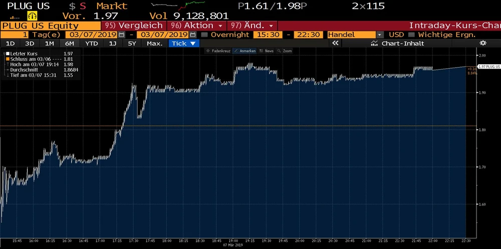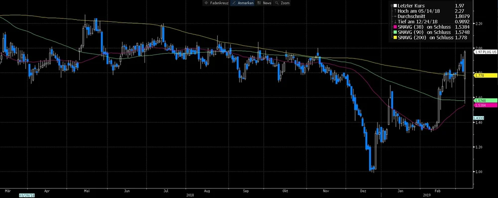 Unter dem Strich musste Plug Power im vierten Quartal einen Verlust von sieben US-Cent je Aktie ausweisen, die Schätzung belief sich auf einen Fehlbetrag von sechs US-Cent pro Papier. Dafür überzeugt der Ausblick: Plug Power bestätigte die Prognosen, Bruttoumsätze zwischen 235 und 245 Millionen Dollar und ein positives bereinigtes EBITDA im Jahr 2019 zu erzielen. Darüber hinaus verspricht Plug-Power-CEO Andrew Marsh vier große Geschäftsankündigungen. Zur kompletten Unternehmensmeldung. Nach herben Kursabschlägen drehte die Aktie kräftig ins Plus und ging mit einem Kursgewinn von 8,8 Prozent aus dem Handel.