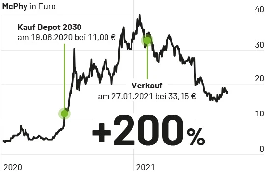 Auch der Trade mit dem französischen Wasserstoff-Start-up McPhy zeigt, wie schnell in bestimmten Börsenphasen und bei richtigem Timing Gewinne möglich sind. Mit rund 200 Prozent Gewinn wurde die Position nach knapp 8 Monaten glattgestellt – und die Erlöse in neue Sektoren investiert, die nun im Jahr 2021 ähnlich unterschätzt und „unten“ sind wie Wasserstoff im Jahr 2019.