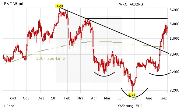 Es ist schon erstaunlich, mit welcher Relativen Stärke die Aktie von PNE im schwierigen Marktumfeld auftrumpft. Seit gut zwei Wochen geht die Post ab und das Papier konnte um satte 22 Prozent zulegen. Zuvor haben sich monatelang nur wenige Investoren für den Windparkprojektierer interessiert. Unter hohem Volumen ist die Aktie nun an der Marke von drei Euro angelangt. Wer stockt auf?