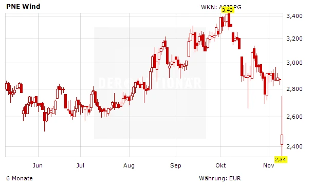 Die Aktie von PNE Wind verliert am Montagabend fast 14 Prozent auf 2,48 Euro. Genauso wie Nordex wird das Papier aufgrund der drohenden Korrektur der Energiewende ordentlich durchgeschüttelt. Ein Neueinstieg drängt sich derzeit nicht auf.