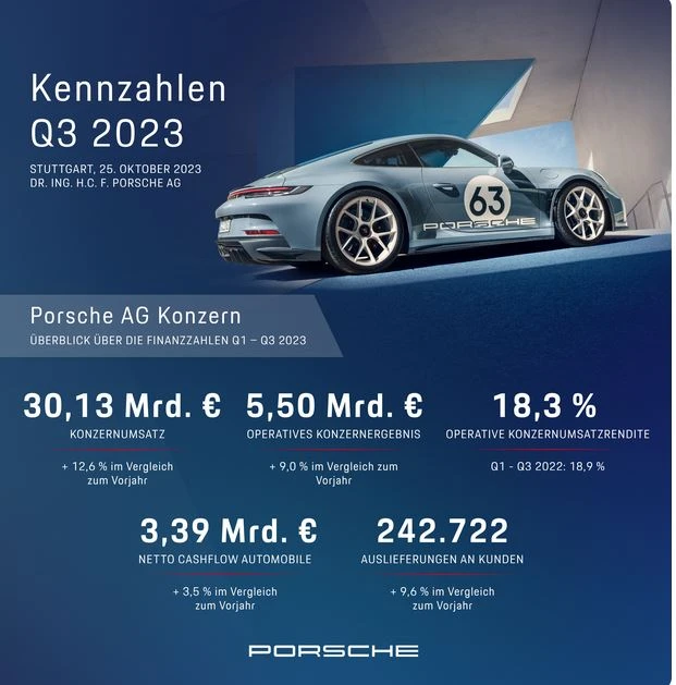 Der Sportwagenbauer Porsche AG hat im dritten Quartal mehr Geschäft gemacht als von Experten erwartet. Der Umsatz kletterte in den ersten neun Monaten im Jahresvergleich um 12,6 Prozent auf 30,1 Milliarden Euro, wie das mehrheitlich zum Volkswagen-Konzern gehörende Unternehmen am Mittwoch mitteilte. Analysten hatten mit einem weniger starken Anstieg gerechnet. Die Marge jedoch lag jedoch etwas unter den Erwartungen der Experten. Darüber hinaus sind die Absätze im wichtigsten Absatzmarkt China weiter rückläufig.