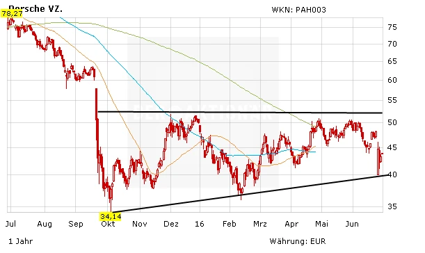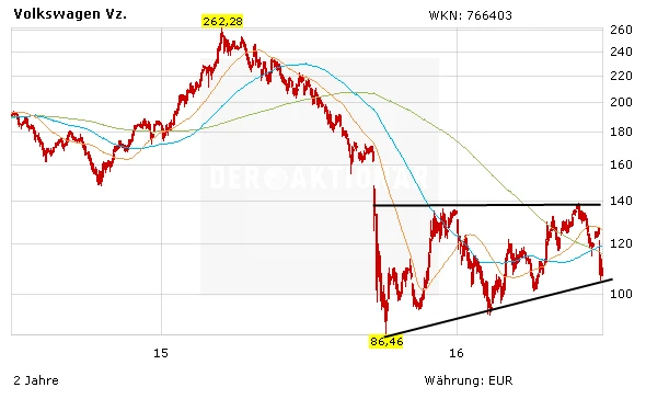 DER AKTIONÄR geht davon aus, dass das Schlimmste im Kurs eingepreist ist. VW hat mit der Strategie 2025 die Grundlage für die Neuausrichtung gelegt. Für Anleger könnte sich aktuell eine interessante Kaufchance ergeben. Bei 116,70 Euro verläuft die 200-Tage-Linie. Darüber hat das Papier wieder Luft nach oben. Porsche ist mit einem Anteil von 52,2 Prozent Großaktionär von VW. Deshalb wird die Aktie wird im Windschatten der VW-Papiere zulegen. Bei beiden Werten sind gute Nerven gefragt!