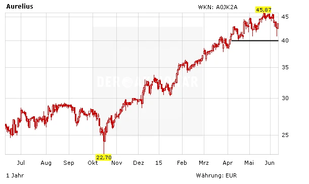 Die Aktie schaffte nach der Konsolidierung ein schönes Intraday-Reversal und könnte nun wieder das Hoch bei rund 46 Euro anpeilen. Der Stopp bei 40 Euro sichert die Position ab.