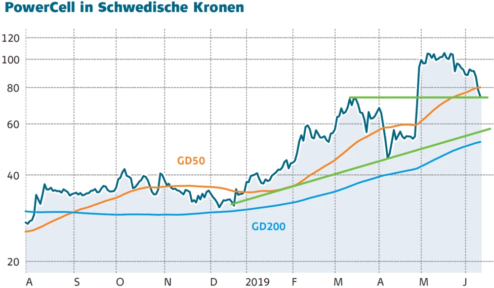 Leider steht die PowerCell-Aktie nach dem Vorfall bei Oslo weiter unter Beschuss und notiert inzwischen im Bereich der Marke von 7,00 Euro, also umgerechnet etwa 75 Schwedische Kronen. Und genau in diesem Bereich verläuft eine wichtige Unterstützungszone.