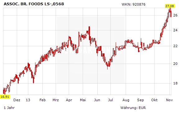 Der britische Multikonzern AB Foods hat mit seinen Jahreszahlen die Analystenerwartungen übertroffen und gleichzeitig neue Rekordwerte erreicht. So kletterte der Umsatz um neun Prozent auf 13,3 Milliarden Britische Pfund (GBP). Gleichzeitig zog der operative Gewinn des Konzerns, der sich auf die fünf Hauptsegmente Zucker, Landwirtschaft, Nahrungsmittel und Einzelhandel konzentriert, auf Jahressicht um zehn Prozent auf 1,1 Milliarden GBP an. Der Gewinn je Aktie verbesserte sich um sechs Prozent auf 74,9 Pence. Den größten Anteil am Wachstum hatte die Billig-Modemarke Primark. Die Kette, die auch in Deutschland mehrere Läden betreibt, konnte den Absatz vor allem dank Neueröffnungen um 22 Prozent ausbauen. Auf vergleichbarer Basis errechnete sich ein ordentliches Wachstum von fünf Prozent. "Es war ein bemerkenswertes Jahr für Primark", sagte Konzernlenker George Weston. Zu den aktuell 257 Läden sollen über Weihnachten noch 13 hinzukommen.