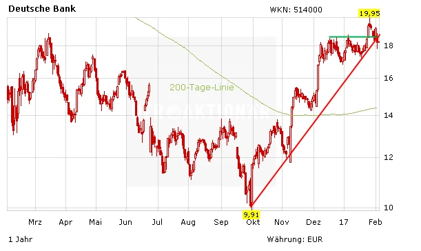 Die Deutsche Bank stochert weiter im Nebel, was die Strategie angeht, die Märkte verlieren langsam die Geduld. Trader können auf einen Bruch des Widerstandes bei 18,45 Euro setzen, wer bereits investiert ist, beachtet die 200-Tage-Linie bei 17,44 Euro.