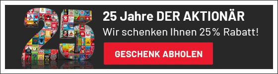 DER AKTIONÄR feiert Geburtstag und Sie können jetzt sogar doppelt davon profitieren: Werden Sie selbst zum AKTIONÄR – wenn Sie sich jetzt das Jubiläumsabo sichern, lesen Sie nicht nur 12-mal DER AKTIONÄR zum exklusiven Vorteilspreis von nur 70 Euro, sondern Sie erhalten gratis dazu das DER AKTIONÄR-Spezialheft zu 25 Jahren DER AKTIONÄR.