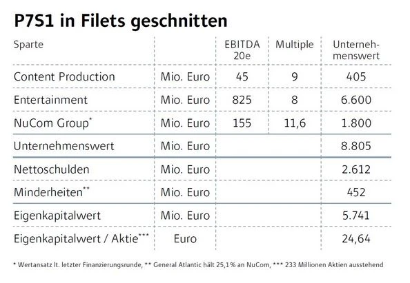 In der nebenstehenden Ableitung möglicher Unternehmenswerte für die einzelnen Sparten lässt sich durchaus ein weiterer Grund für den Einstieg eines aktivistischen Investors finden. Filetiert in kleinere Einheiten wäre durchaus mehr drin als der aktuelle Kurs hergibt.
