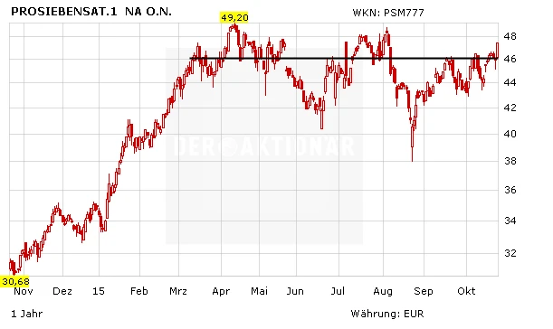 Die angehobenen Gewinn- und Umsatzprognosen konnten der ProSieben-Aktie kräftig Schwung verleihen. In den letzten beiden Wochen stieg der Kurs um fast zehn Prozent. Durch das heutige Plus wurde der Widerstand bei 46 Euro überwunden und somit ein Kaufsignal generiert. Das Testen der Marke auf Höhe des Allzeithochs bei 49,20 Euro scheint nur noch eine Frage der Zeit. Auch die Dividendenrendite von vier Prozent überzeugt. Die ProSieben-Aktie steht weiterhin auf der Empfehlungsliste des AKTIONÄR.