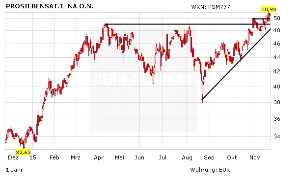 Schon zu Beginn des Monats hatte die Aktie aufgrund der starken Quartalszahlen ein neues Rekordhoch erreicht. Von diesem Niveau aus konsolidierte der Titel in den Folgewochen etwas. Am Donnerstag kletterte die Aktie des Medienkonzerns über die letzte Hürde bei 49,90 Euro und erzeugte somit ein neues Kaufsignal. Der Weg nach oben ist jetzt frei. Aufgrund des technischen Kaufsignals und der stark laufenden Geschäfte hat DER AKTIONÄR die ProSiebenSat.1-Aktie in sein Aktien-Musterdepot aufgenommen.