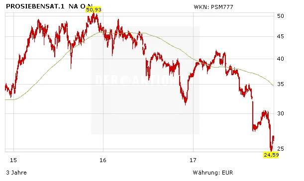 Die Aktie von ProSiebenSat.1 hat seit Jahresanfang fast 30 Prozent an Wert verloren und ist damit der schwächste Wert im DAX. Erst Mitte November war der Kurs bei 24,50 Euro auf den tiefsten Stand seit dem Jahr 2013 gefallen. Seit dem Einzug in den DAX im März 2016 beläuft sich das Minus sogar auf über 40 Prozent.