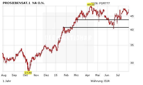 Die Aktie von ProSiebenSat.1 ist nach wie vor attraktiv. Mit der zunehmenden Digitalisierung bleibt der Konzern auf Erfolgskurs. Seit dem Amtsantritt von Vorstandschef Thomas Ebeling hat der DAX-Kandidat bereits über 3.000 Prozent zugelegt. Trotz des volatilen Gesamtmarkts steht die Aktie inzwischen vor einem neuen Allzeithoch. Der Stoppkurs des AKTIONÄR liegt bei 34,00 Euro.