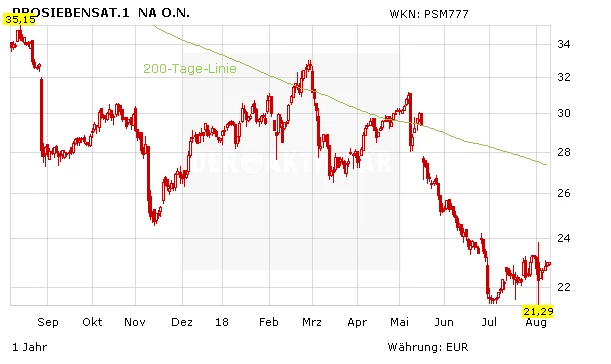 Strukturelle Probleme im wichtigen Werbegeschäft haben die ProSiebenSat.1-Aktie in den letzten Monaten immer wieder belastet. Erst vor kurzem war der Kurs bei 21,29 Euro auf dem tiefsten Stand seit über fünf Jahren gefallen. Die vor einer Woche veröffentlichten Q2-Zahlen fielen nicht ganz so schlecht wie vermutet aus, dennoch lieferten auch diese keinerlei Impulse für den angeschlagenen Aktienkurs.