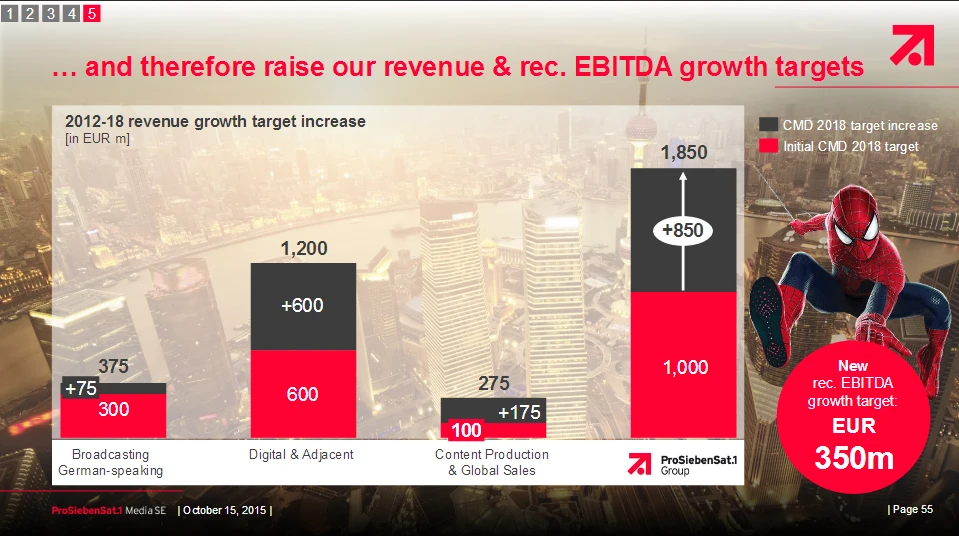 Im Zuge der Übernahme der Parship Elite Group im September hatte Finanzvorstand Gunnar Wiedenfels bereits eine erneute Anhebung der mittelfristigen Finanzziele bis 2018 in Aussicht gestellt. Im Vorjahr hatte ProSiebenSat.1 den Capital Markets Day schon einmal zur Anhebung der Mittelfristziele genutzt.