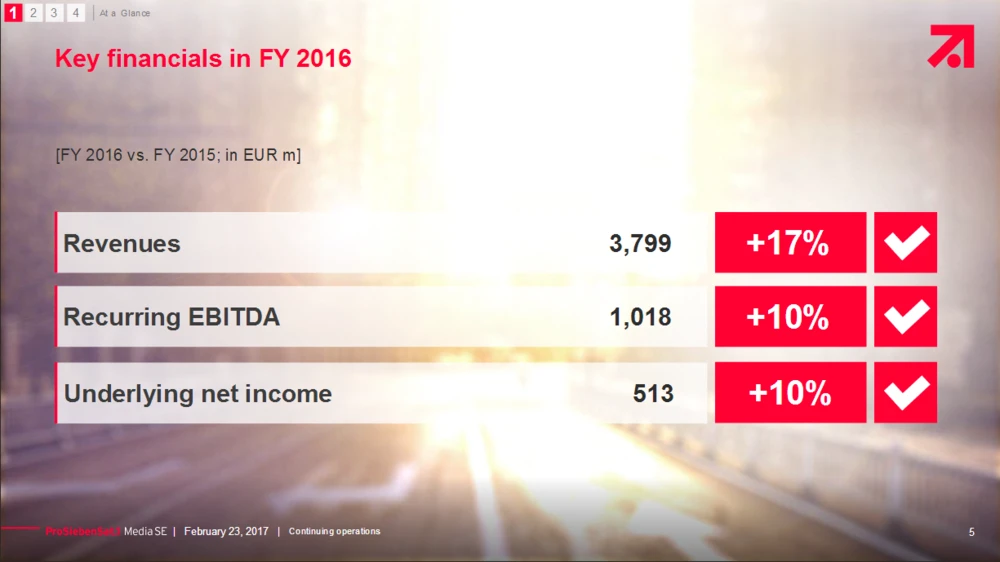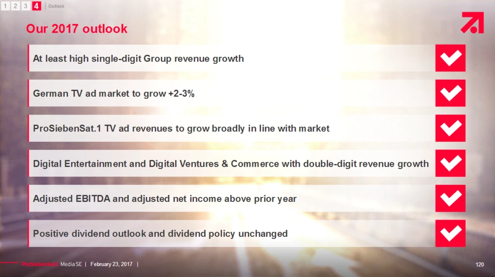 ProSiebenSat.1 sei gut in das erste Quartal gestartet und blicke zuversichtlich auf das Geschäftsjahr 2017. Auf Jahressicht soll der Konzernumsatze mindestens im hohen einstelleigen Prozentbereich steigen. Bei EBITDA und Überschuss will das Unternehmen das Vorjahresniveau übertreffen. Auch hinsichtlich der im Oktober 2016 erneut angehobenen Mittelfrist-Ziele bis 2018 sieht sich der Vorstand auf einem guten Weg.