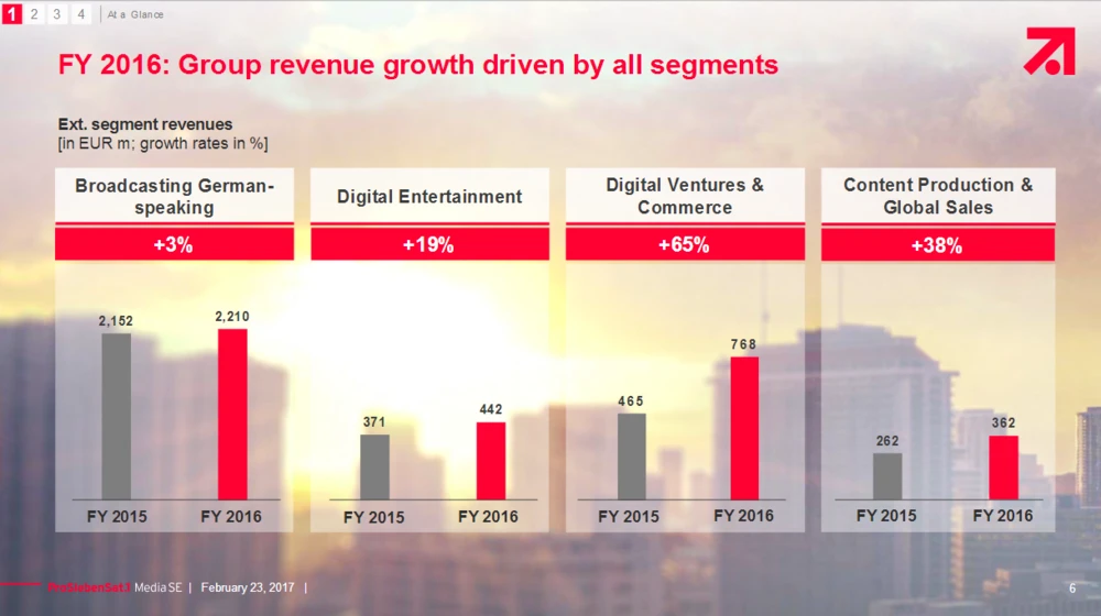 Im TV-Kerngeschäft hat ProSieben den Umsatz um drei Prozent auf 2,2 Milliarden Euro im Vergleich dazu nur leicht gesteigert. Das Unternehmen ist jedoch auf einem guten Weg, die Abhängigkeit vom schwankungsanfälligen Werbegeschäft zu senken. Der Anteil am Konzernumsatz, den ProSieben außerhalb des TV-Geschäfts erwirtschaftet ist 2016 von 39 auf 47 Prozent gestiegen. 2018 soll der Anteil 50 Prozent übersteigen.