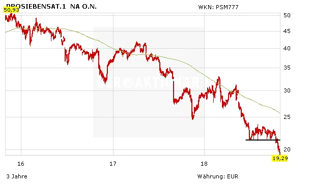 Die Investoren reagieren am Montag erleichtert, dass sich bei dem angeschlagenen Medienkonzern endlich wieder etwas tut – in Anbetracht des weiterhin rückläufigen Kerngeschäfts mit TV-Werbung braucht ProSiebenSat.1 dringen neue Erlösquellen. Am stark eingetrübten Chartbild kann jedoch der heutige Kursanstieg um rund drei Prozent kaum etwas ändern. Zudem rechnen Analysten bei den Q3-Zahlen am 8. November mit einer neuerlichen Enttäuschung. Anleger sollten daher vorsichtig bleiben. ProSiebenSat.1 steht derzeit nicht auf der Empfehlungsliste des AKTIONÄR.