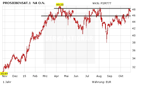 Seit der Erhöhung der mittelfristigen Unternehmensziele und dem entsprechend positiven Analysten-Echo ist die Aktie von ProSiebenSat.1 wieder auf Rekordkurs. Das Allzeithoch bei 49,20 Euro ist wieder in greifbare Nähe gerückt. Die Aktie des Medienkonzerns steht weiterhin auf der Empfehlungsliste des AKTIONÄR.