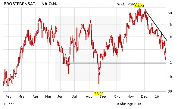 So hat die Schweizer Großbank UBS die ProSiebenSat.1-Aktie mit einem Kursziel von 40 Euro und einem Verkaufsvotum in die Bewertung aufgenommen. Europäische Fernsehunternehmen seien insgesamt nicht gerade überzeugend bewertet, sodass Anleger selektiv vorgehen sollten, schrieb Analyst Richard Eary. Der strukturelle Druck nehme zu. Bei den Aktien südeuropäischer TV-Konzerne rät er zum Kauf, bei nordeuropäischen eher zum Verkauf. ProSiebenSat.1 zählt er inzwischen zu den unattraktivsten Werten.