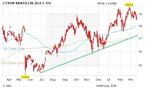 Ein prozyklischer Blick nach Brasilien dürfte sich also auch in Zukunft für Anleger lohnen. Die Gewinne je Aktie könnten im laufenden Jahr um 60 Prozent wachsen. Die Bewertung der brasilianischen Papiere mit einem 18er-KGV von 13 ist dabei verglichen mit dem 18er-KGV von 17 des US-Markts attraktiv. Für ein Investment in das Schwellenland bietet sich der Lyxor ETF Brazil (WKN: LYX0BE) an.
